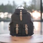 Zaino “old school” stile da montagna, con svariate tasche, cerniere e inserti in cuoio.